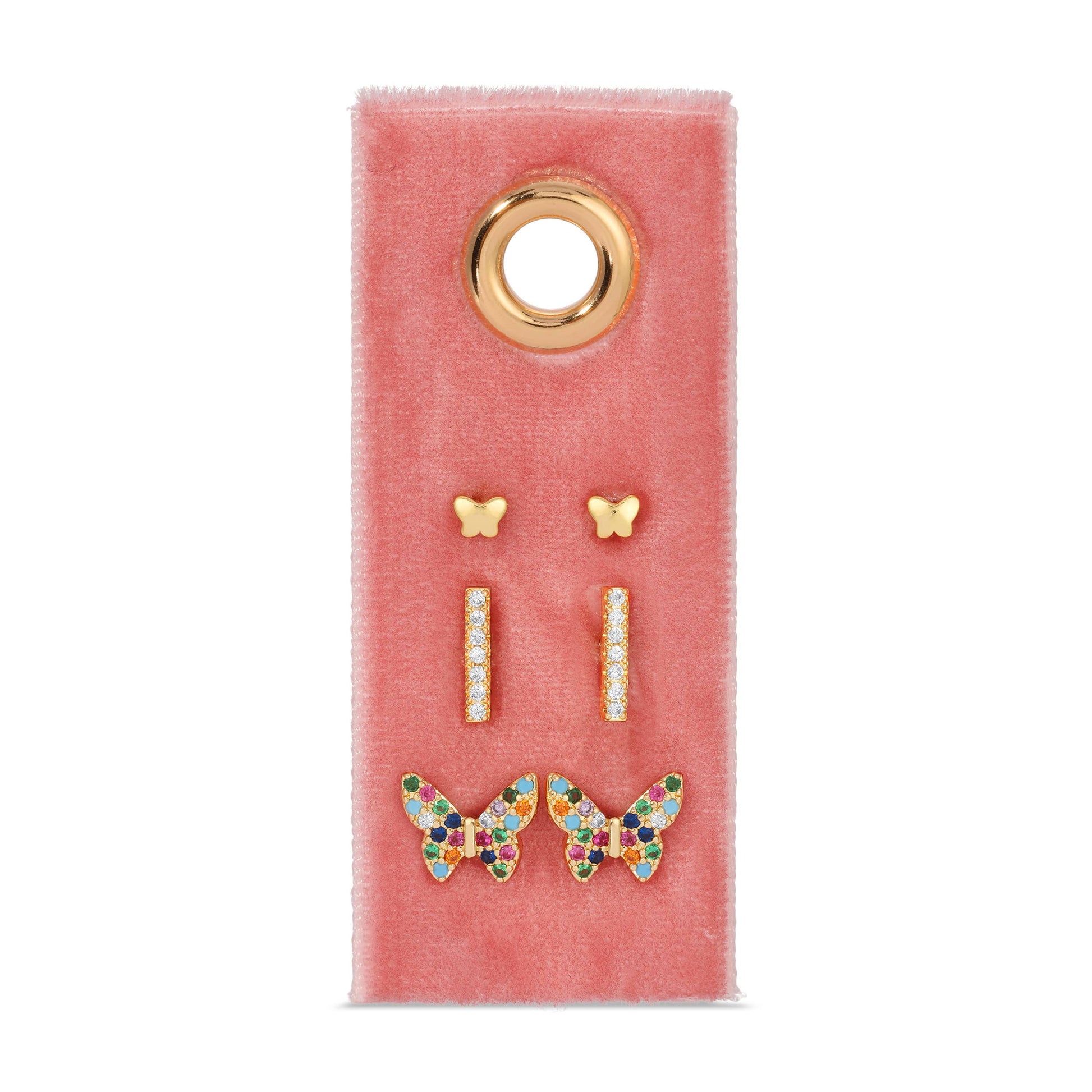 Three delicate butterfly studs that flutter into your ear game. This playful set includes a tiny butterfly, a sparkly pave bar, and a colorful pave butterfly—all crafted with 18k gold plating and cubic zirconia for that brilliant shine. Mix, match, and stack to your heart's content.